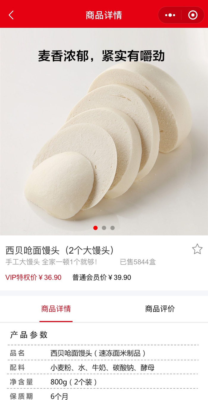 新京报记者在西贝莜面村的网上商城也有标明“门店同款”的馒头,两个装共800克的馒头售价为39.9元。商品配料表显示包含了小麦粉、水、牛奶、碳酸钠和酵母。目前网上商城“已售5844盒”。