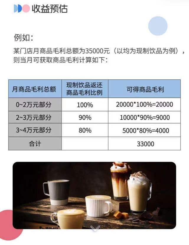 对于加盟商可获得的利润预期,瑞幸咖啡表示,在商品收入扣掉成本100%作为商品毛利返还给新零售运营合作伙伴。只有当毛利超过2万元后,返还比例开始递减,直至8万元以上,比例降低为60%。