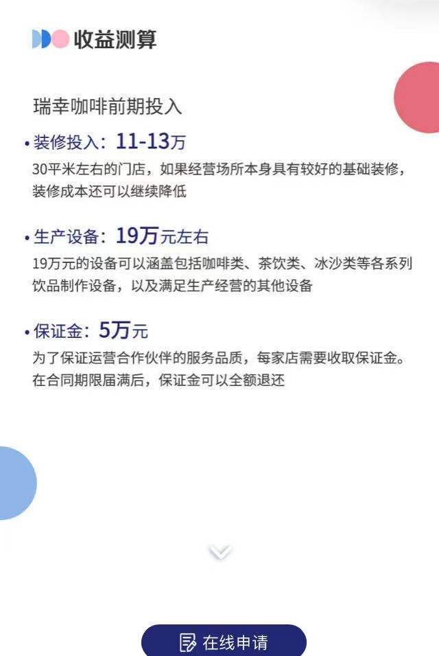 瑞幸咖啡官方披露加盟信息显示,加盟方需支付瑞幸咖啡提供的前期投入总费用在35-37万之间,具体包括装修费用11至13万元、生产设备19万左右以及保证金5万元。