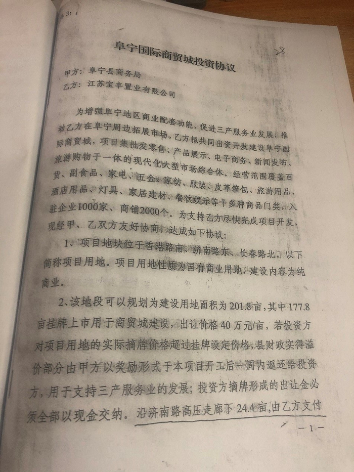 据悉,江苏宝丰置业有限公司(乙方)与阜宁县商务局(甲方)曾于2013年9月签署《阜宁国际商贸城投资协议》(下称《投资协议》)。《投资协议》明确表示:“沿济南路高压走廊下24.4亩,由乙方支付相关征地成本后用于商贸城停车场等配套设施建设,征地及拆迁、附着物补偿费用为8万元/亩”。
