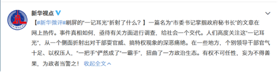 1月18日晚,新华社官方微博“新华视点”发布评论《刷屏的“一记耳光”折射了什么?》,文中写道:“人们高度关注这‘一记耳光’,从一个侧面折射出对干部耍官威、搞特权现象的深恶痛绝。在一些地方,个别领导干部官气十足、以权压人,‘一把手’俨然成了‘一霸手’,扭曲了一方政治生态。有权不可任性,妄为不得善果,为政者当警之!”