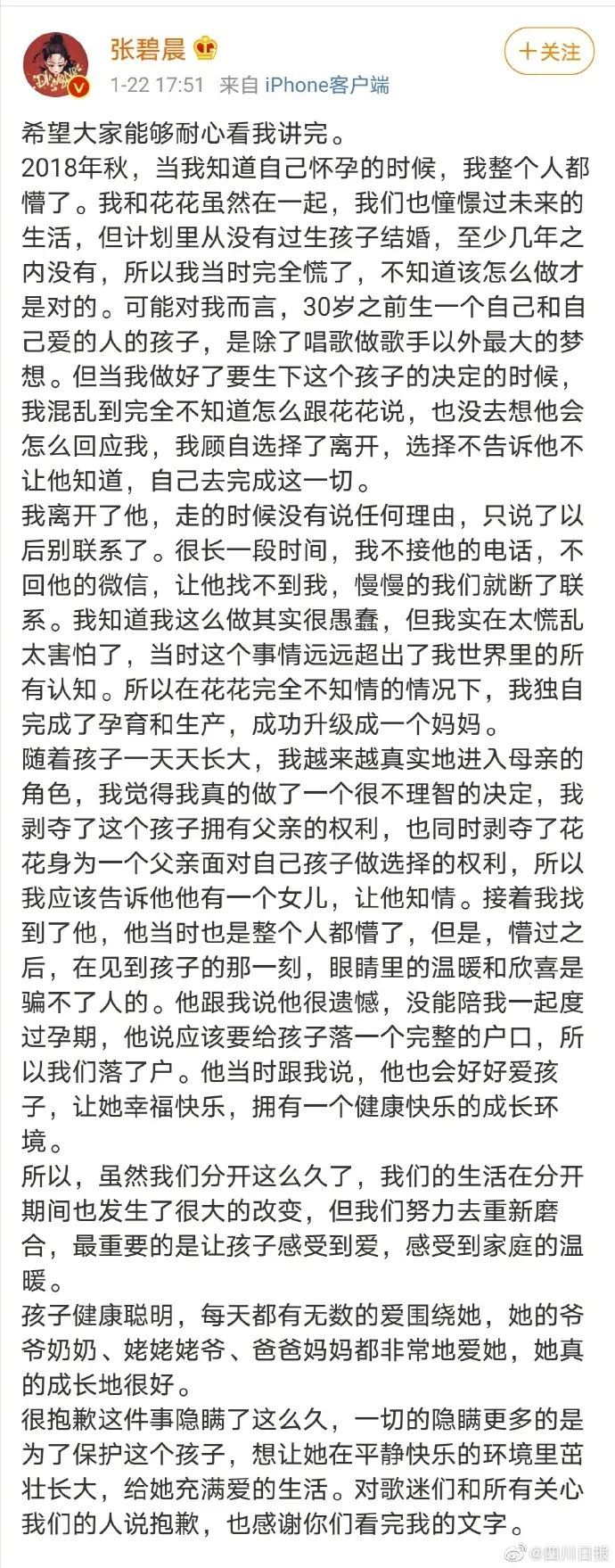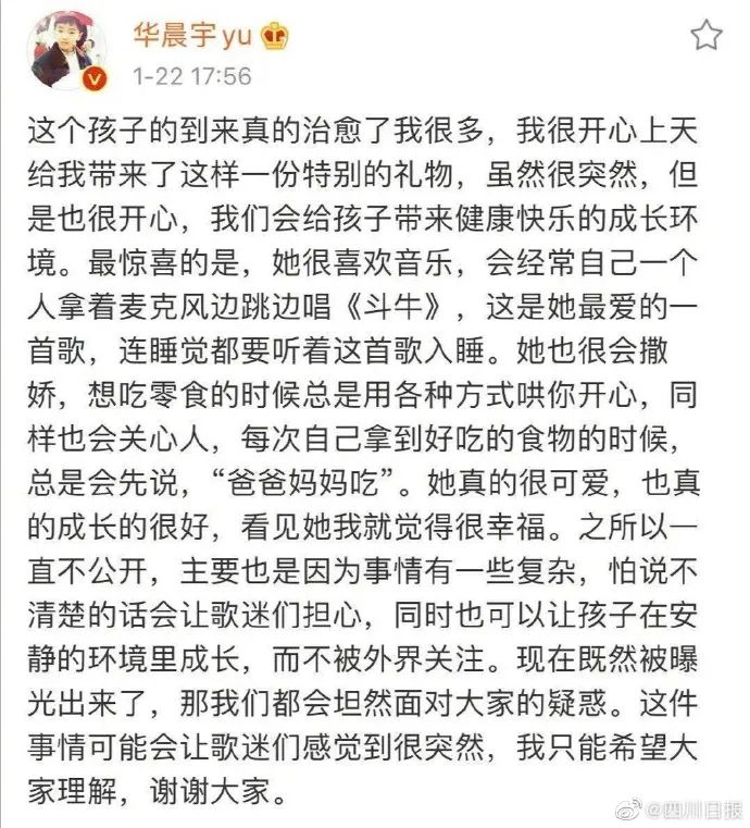 近日,网曝中国内地男歌手华晨宇和女歌手张碧晨有孩子了,目前已经一岁。对此,22日微博认证为华晨宇的账号回应:“是的,我们是有一个孩子。”并表示,双方将在无婚姻关系前提下抚养孩子。震惊一众网友,迅速登上微博热搜榜。