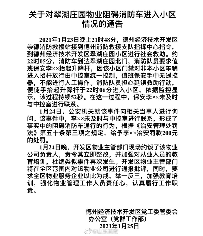 1月25日,@山东消防 微博消息,德州经济技术开发区党工委管委会办公室(党群工作部)发布《关于对翠湖庄园物业阻碍消防车进入小区情况的通告》,2021年1月23日晚上21时48分,德州经济技术开发区崇德消防救援站接到德州消防救援支队指挥中心指令,到德州经济技术开发区翠湖庄园小区进行社会救助。约22时05分,消防车到达翠湖庄园北门,消防队员要求值班保安李××抬起升降杆,因该小区门禁对非本小区车辆进入抬杆放行由中控室统一控制,值班保安手中无遥控器,不能进行人工操作。消防队员担心延误救助行动,便徒手抬起升降杆于22时06分进入小区,依据监控显示,该过程持续52秒。在这一过程中,保安李××未及时与中控室进行联系。