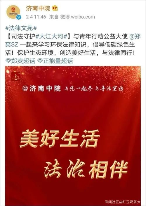 网友保留的截图显示,重庆四中法院和济南中院两家法院的官微所发布的文案基本一致,皆称呼郑爽为青年行动公益大使,号召网友“一起来学习环保法律知识,倡导低碳绿色生活!保护生态环境,创造美好生活,与法律同行”。