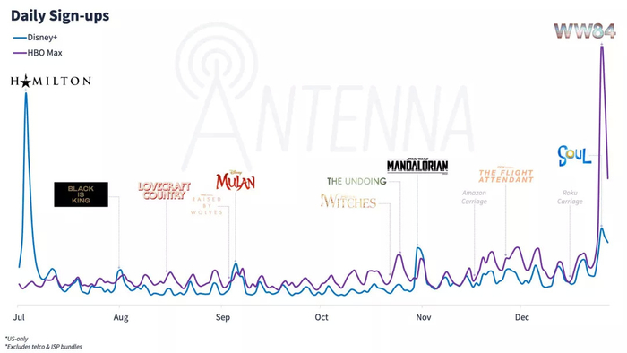 尽管迪士尼官方未曾公布《花木兰》的流媒体收入情况,但从第三方机构Antenna Analytics公布的数据来看,《花木兰》对Disney+用户增长的意义并不如《冰雪奇缘2》和《1/2魔法》大,更不用说大热的《汉密尔顿》。