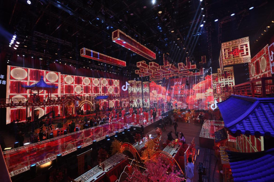 在2021北京台春晚舞台的场景建构中,节目组首次融入了“城市中轴线”的设计概念。导演组在表演空间的设计中就巧妙地同构了“中轴线”的微缩模型,以舞台中轴线为核心向附属表演区域扩张延伸,通过物理性的移动装置,将几个块状表演区域组合拼接为一个空间整体,为观众呈现出360度全景沉浸的舞台环境。