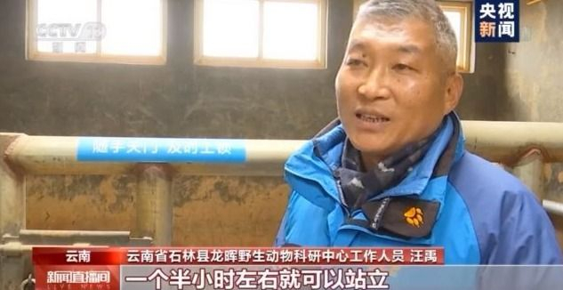 云南省石林县龙晖野生动物科研中心工作人员 汪禹:“它出生以后,一个半小时左右就可以站立。站立以后大概有十几分钟,就可以徐徐慢步行走 ”。