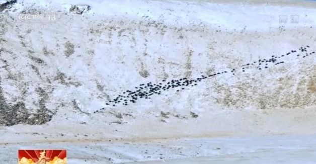 它们时而分成数量不等的小群,又时而集结成一个横向排开的大群,在平缓起伏的皑皑雪原中逐渐远去,并消失不见。经工作人员粗略清点,约有两百头之多,是近几年青海地区观测到的最大的野牦牛种群。