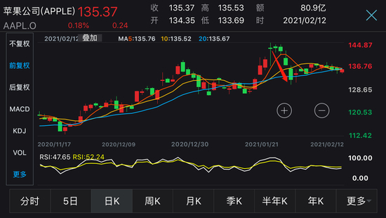在苹果发布财报之后,股价却在1月25日晚间创下历史新高144.87美元之后,开启了四连跌。