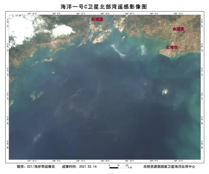 据了解,2021年2月14日北部湾海域晴空,海洋一号C/D卫星海岸带成像仪上、下午均经过该海域,在获取的图像上发现明显的异常,而2021年2月11日该区域没有明显异常。经处理分析,异常区位于涠洲岛西南部海域,分布范围较广,大致位于107.9-108.8°E,20.4-21.3°N,水色异常区最东侧距离涠洲岛约31km。异常区域色彩呈金色、部分棕色,形状呈条、线状,分布类似去年东海夜光藻特征,初步估计是夜光藻赤潮,其面积约6400千平方公里。随后,该中心将图像及时发送给了南海局、广西卫星应用技术中心。