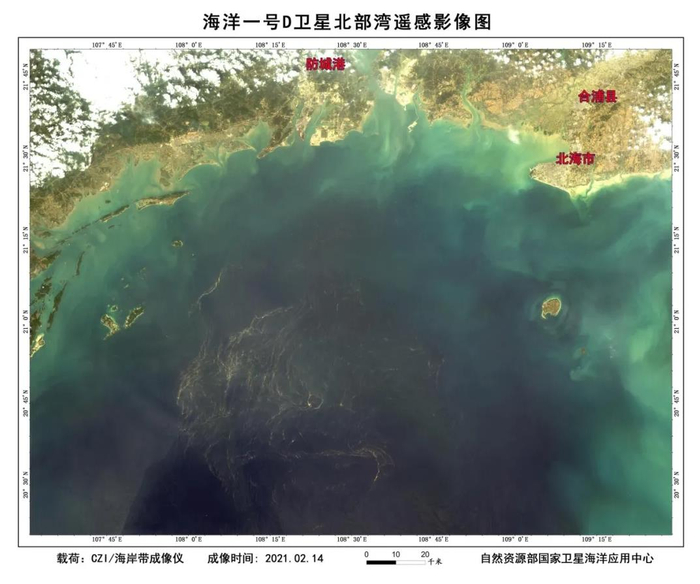 据自然资源部国家卫星海洋应用中心消息,春节期间,海洋卫星没有“休假”,依旧坚守岗位。2021年2月14日海洋一号C/D卫星海岸带成像仪均捕捉到北部湾大面积赤潮,面积约6400平方公里,2021年2月17日海洋一号C/D卫星海岸带成像仪图像显示赤潮已经消失。