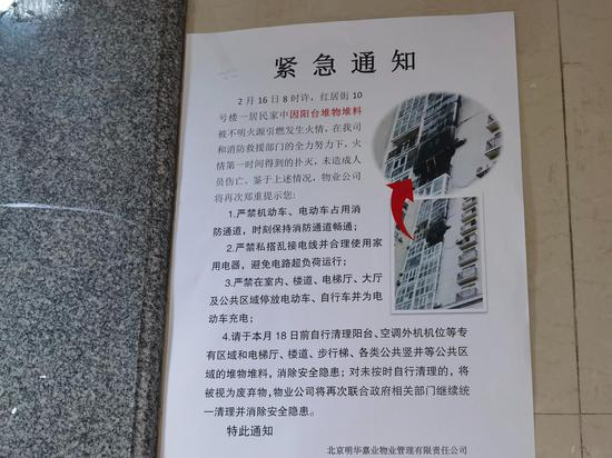在楼道内,小区物业张贴了一张紧急通知,提示大家“严禁机动车、电动车占用消防通道,时刻保持消防通道畅通”等注意事项。