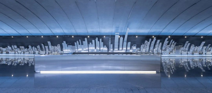 站厅中最引人注目的设计,则是两侧展示上海城市景观的景墙。穿过地铁站的长廊,就像穿过一个展示上海改革开放城市建设的华丽展厅。如果把站厅地面看成黄浦江,那么它的两侧就是浦东和浦西壮观的城市景象,而站厅的两端则象征着上海壮美的未来。
