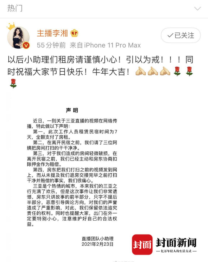 2月23日中午12点,封面新闻记者联系到了李湘。李湘给封面新闻记者传来了直播团队的三点声明,进行了回应,原文如下: