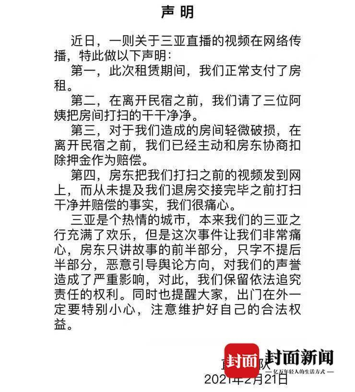 三亚是个热情的城市,本来我们的三亚之行充满了欢乐,但是这次事件让我们非常痛心,房东只讲故事的前半部分,只字不提后半部分,恶意引导舆论方向,对我们的声誉造成了严重影响,对此,我们保留依法追究责任的权利。同时也提醒大家,出门在外一定要特别小心,注意维护好自己的合法权益。