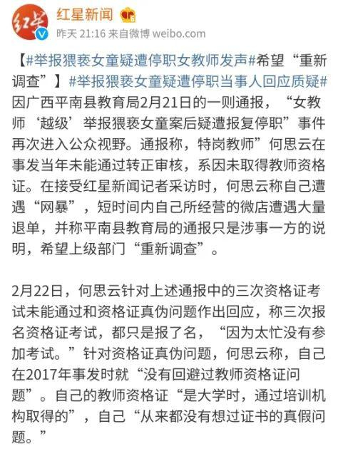 第二天,何思云接受红星新闻采访时,称平南县教育局的通报只是涉事一方的说明,她希望上级部门“重新调查”。