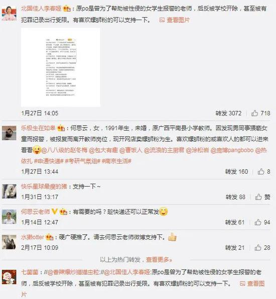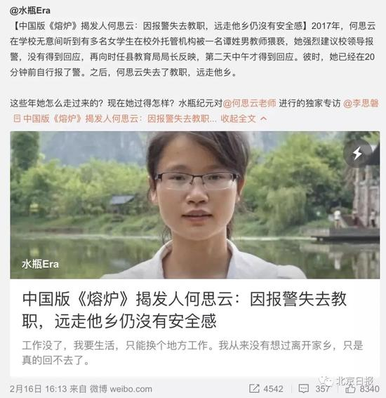 文章提到,广西平南县原小学教师何思云在2017年时,因为“越级”报警解救被男老师猥亵的女学生,遭到当地报复,丢了工作远走他乡,不得不开网店卖螺蛳粉,“仍没有安全感”。