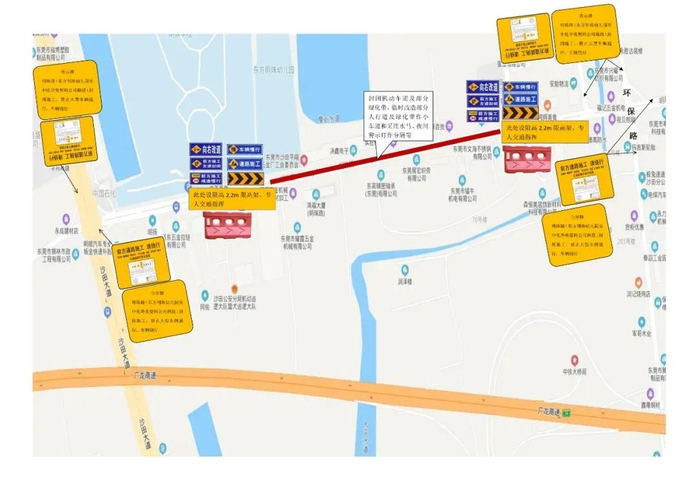 注意事项:封闭施工期间,禁止大型车辆通行,建议经由轮渡路或家具大道绕行;小型车辆可通过临时车道通行,但通行车速须控制在20公里/小时以内;