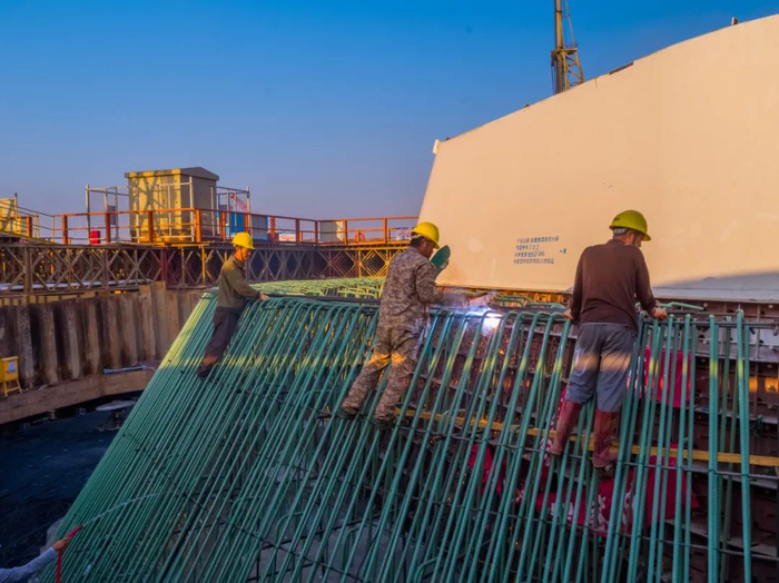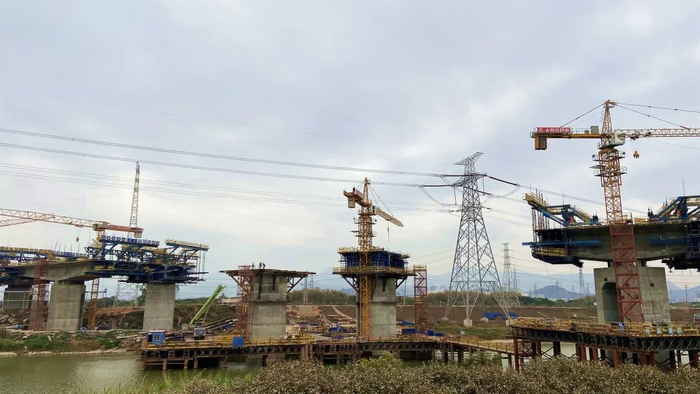 年味还未散去,滨海湾大桥项目工地已是热气腾腾的建设氛围,机器轰鸣,塔吊运转不停,工人们正在模板上安装钢筋,浇筑混凝土,建设现场热火朝天、一片忙碌。