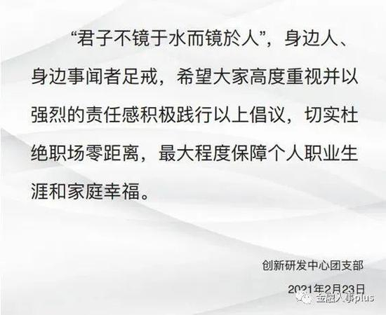 在这份《倡议书》的最后,创新研发中心团支部还做出如下总结:“‘君子不镜于水而镜於人’,身边人、身边事闻者足戒,希望大家高度重视并以强烈的责任感积极践行以上倡议,切实杜绝职场零距离,最大程度保障个人职业生涯和家庭幸福。”