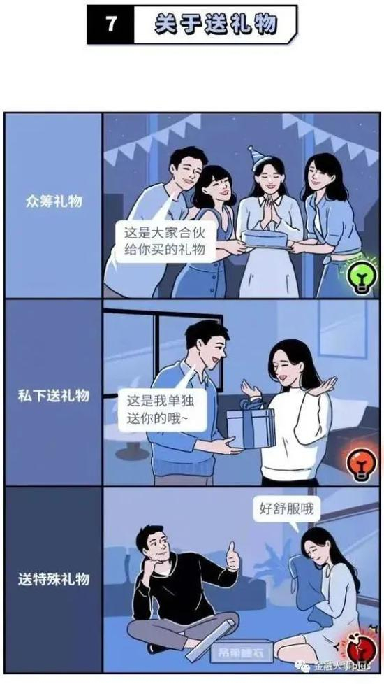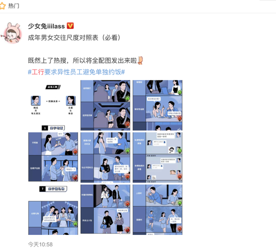 值得注意的是,倡议书还对异性同事在用餐、搭顺风车、帮忙、送礼物等十个场景中的“规范”做法以漫画的形式进行展示。不过,据每日经济,该组漫画来自微信公众号“少女兔”的原创。