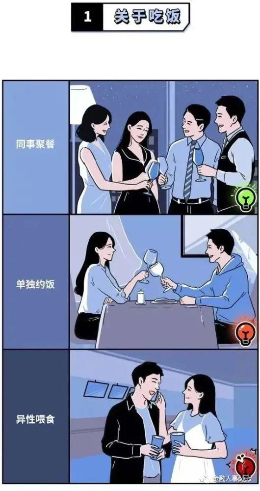 在用餐方面,漫画倡议同事集体聚餐避免异性单独约饭以及异性喂食;