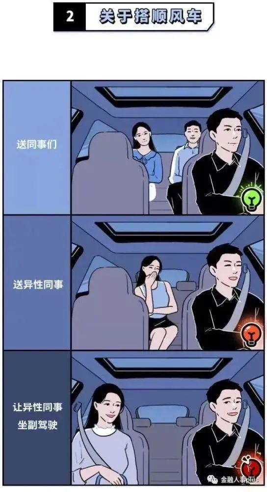 关于搭顺风车,漫画倡议避免单独送异性同事或让异性同事坐副驾驶;