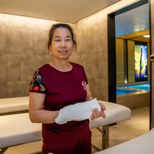 客人趴着,罗永芹耳垂上的珍珠坠子摇摇晃晃,汗水从额角往下淌。身上的“战衣”早已湿透,“我出汗量不算大,工作服每天换洗一次,有的姐妹一天要换两三次。因为出汗多,每天上厕所的次数很少。”