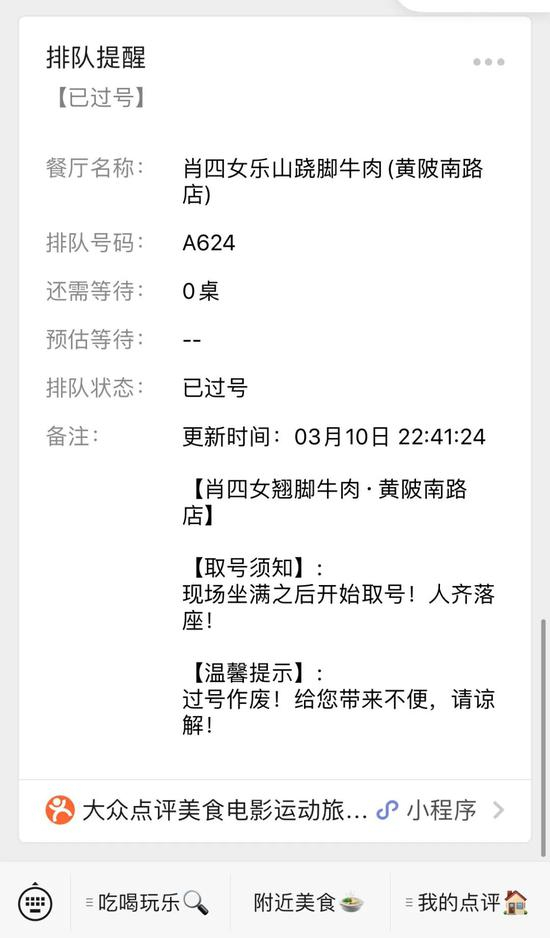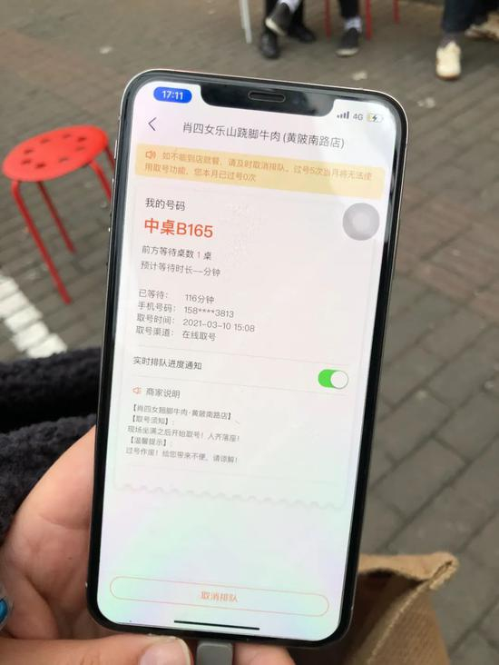 记者于4:08分取号成功,还需等待304桌。最终直到22:41分才排到,而餐厅于23:00打烊。
