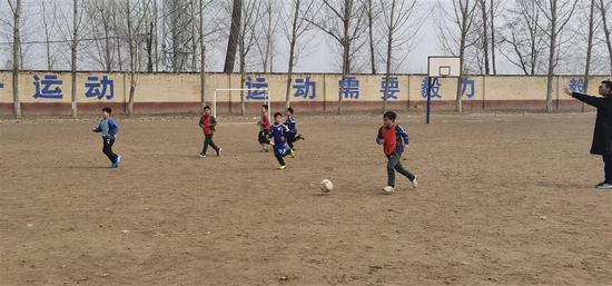 2021年3月5日下午,下课铃声响彻校园。张梓予和数十个孩子从教室奔向器材室,又颠着足球冲到操场。此时,特岗教师李乾佑捧着一箱队服来到操场,用画线器在泥地上画出边界,又叮嘱在操场上撒欢的球员们换上队服,准备热身运动。