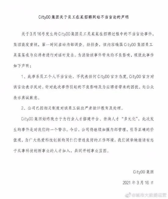 16日晚间,涉事公司CityDO集团在其官方微博@城市大数据运营发布了一则声明。声明称,此事系员工个人不当言论,不代表任何CityDO官方态度,CityDO官方对该言论表示反对,并向公众表示真诚歉意;此外,公司对该员工做出严肃批评教育及处理。