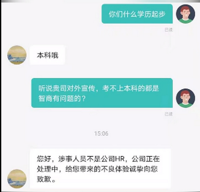 原标题:侮辱性极强!招聘时直言“考不上本科是智商问题”,这家公司回应了!
