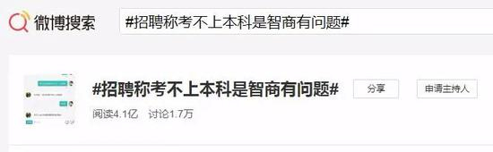 随后,该聊天记录在网上传开,引发超4亿网友热议,话题“招聘称考不上本科是智商有问题”登上新浪微博热搜榜。