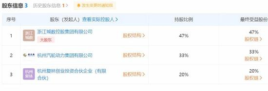 股东分别为浙江城数控股集团有限公司、杭州汽轮动力集团有限公司和杭州复林创业投资合伙企业(有限合伙),持股比例分别为47%、33%和20%。