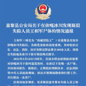 3月17日,西藏那曲嘉黎县公安局发布情况通报,于2021年3月14日对依嘎冰川下游河道巡查时,在冰层下发现一具尸体,疑似此前意外落水失踪人员王相军(网名为“西藏冒险王”)。消息一经发出,引发网友争相热议,话题#西藏冒险王遗体疑似被找到#登上微博热搜,阅读量达到2.2亿。3月18日,正观新闻记者尝试联系嘉黎县公安局,截止发稿前一直显示“拨打电话正忙”。