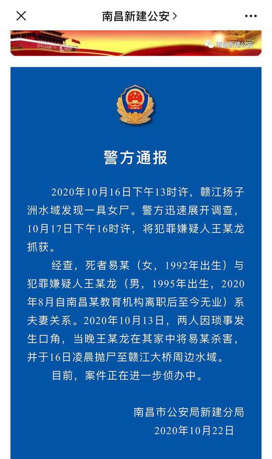 10月22日,南昌市公安局新建分局公开通报,10月16日下午,赣江杨子洲水域发现一具女尸。经查,死者与犯罪嫌疑人王某龙系夫妻关系。10月13日,两人因琐事发生口角,当晚王某龙在其家中将女方杀害,并于凌晨抛尸。