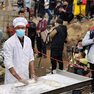 他在拉面的过程中,偶尔环顾一下周围的人裙,用憨厚的微笑示意,随后很快将视线放回手里的面团。