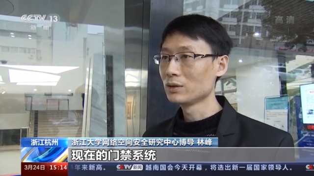 浙江大学网络空间安全研究中心博导 林峰:现在的门禁系统基于人脸的门禁系统,是非常脆弱的。现在我来演示一下:我对这个门禁系统是没有权限的,所以我们看到当它检测到我之后,这个门没有任何反应。然后我的一个朋友,他传给我一张照片,他是对这个门禁系统是有权限的 ,所以我拿这张照片,放在这个门禁系统前面,摆一下它就能认证是这个用户。