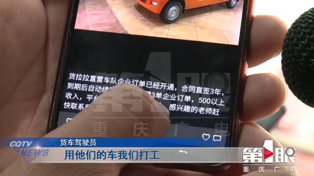 第1眼-重庆广电消息,璧山星期天公司以成立货拉拉直营司机团队为噱头,虚假宣传优先派单,用平台不抽成,高额收入等条件忽悠货车驾驶员买车。在两天前,630播出了这条新闻。新闻播出以后,记者又得到了很多地方货车驾驶员的投诉。
