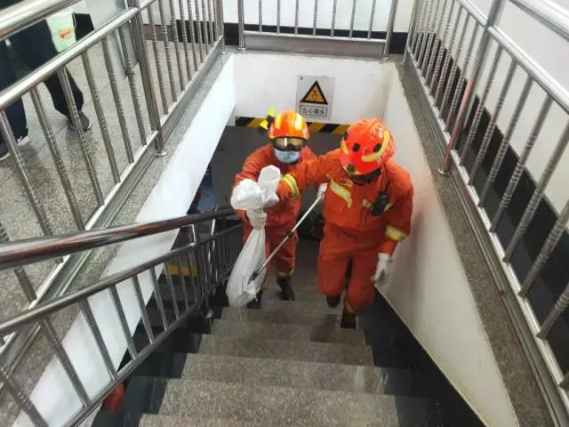 另一组人员在蹲坑下水道下方打开管道,利用编织袋套住管道,上方消防救援人员用捕蛇钳将蛇往下赶,最终成功将其捕获。