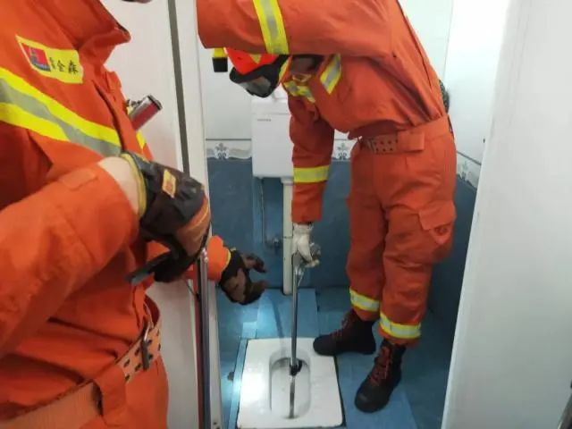 消防救援人员,在厕所内用捕蛇工具夹住蛇的头部,防止其乱窜伤人。
