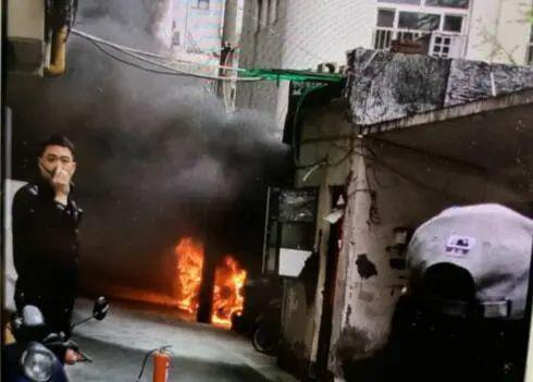 燕子弄是老小区,水泥墙构造的半露天车库沿着单元门笔直一排,平时居民都把车停在这里进行充电。从当时市民拍摄的视频和照片中可以看到,当时几辆电动车燃起熊熊大火,电瓶起火后,迅速产生了大量黑色浓烟。