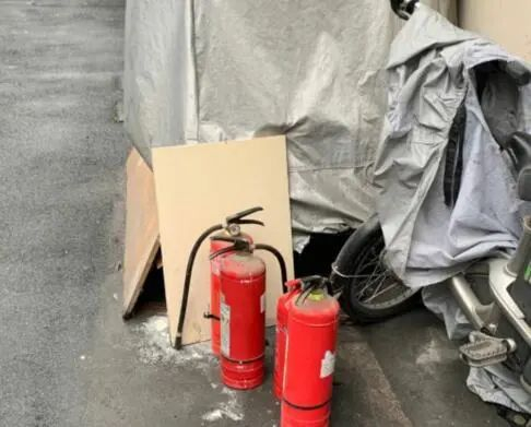 小吴一看,赶紧跑接过灭火器,往前又靠近了一步,对着起火的电动车喷灭火器。