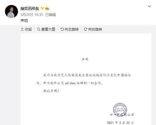3月25日,陈奕迅用自己的微博宣布“终止与adidas品牌的一切合作”。