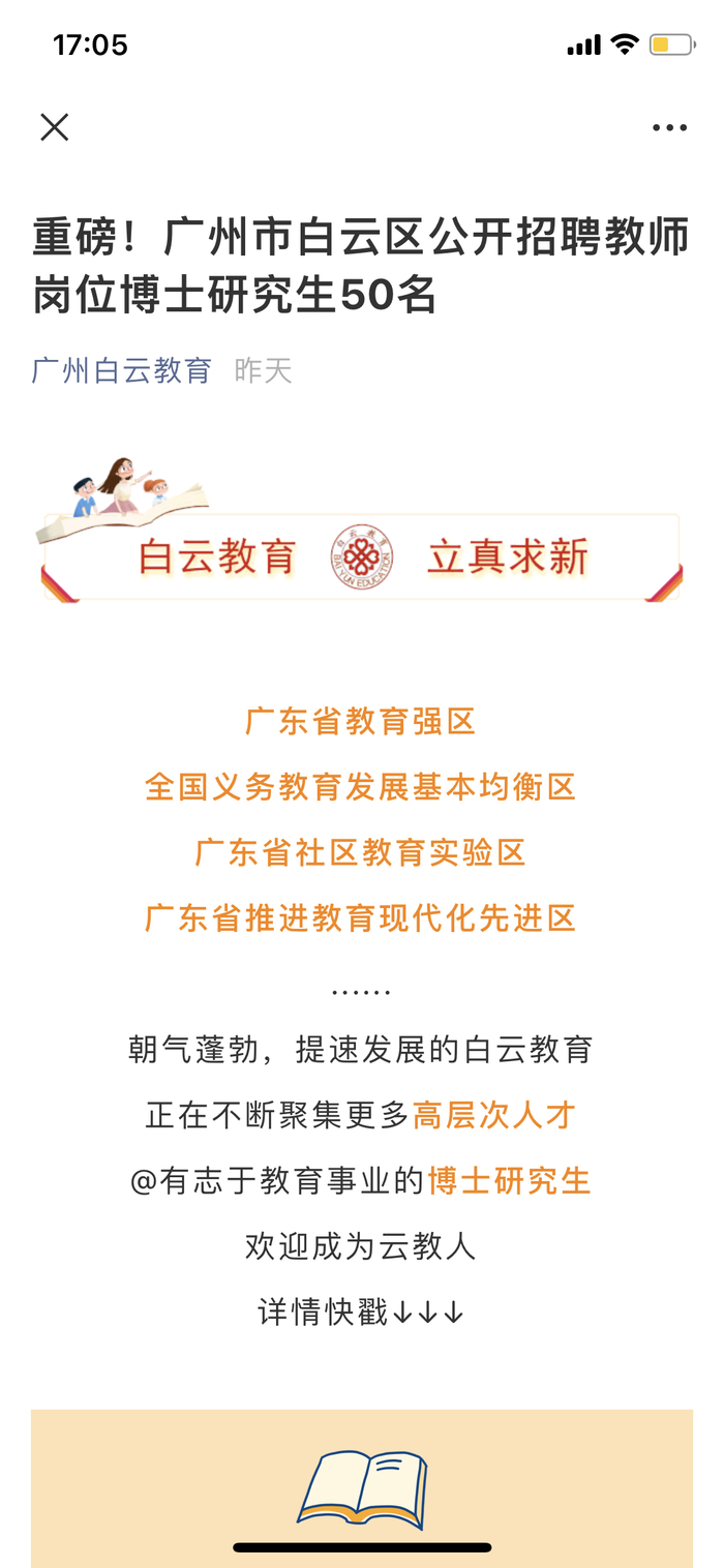 广州白云区教育局回应“招50博士做中小学老师”:多为高中教师