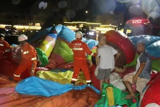2015年6月,广西田阳一充气城堡被风吹出30多米远,一名小女孩抢救无效死亡。