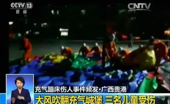 2016年2月,广西贵港充气城堡没有固定好,因风吹发生了侧翻,2名儿童轻伤,一名8岁儿童重伤昏迷。
