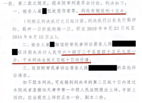 2020年8月18日,该案在天津市红桥区人民法院开庭。法院认定崔某犯故意伤害罪,判处有期徒刑15年,赔偿小陈父母经济损失64万余元。当时双方均不服判决,分别提出上诉。天津市第一中级人民法院2020年12月2日作出终审裁定,驳回上诉,维持原判。