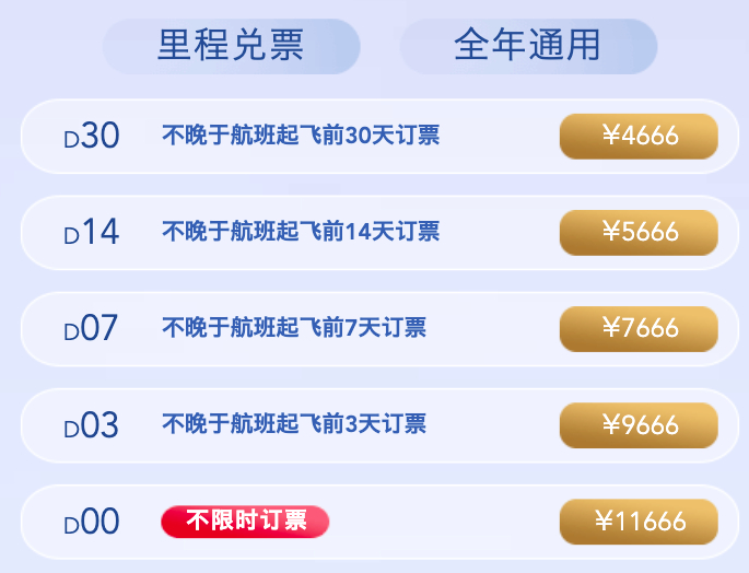 也就是说,东航此款产品实质是预售里程,根据预订座位的最晚时限给出不同定价。“前程万里”产品根据订座换票的最晚时限(早于航班起飞日期的天数)不同,分为D30、D14、D07、D03和D00五种规格,售价各不相同,为4666元至11666元。产品持有人可以固定一名2至16周岁的少年儿童在同行时使用等额产品里程进行订座换票,从所持产品的里程余额中扣减。