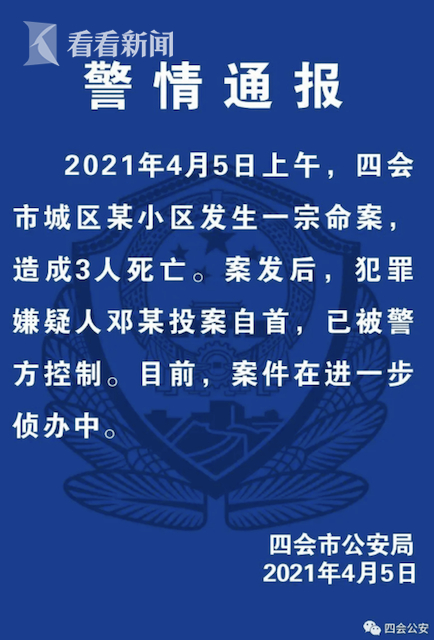 警方通报:2021年4月5日上午,四会市城区某小区发生一宗命案,造成3人死亡。案发后,犯罪嫌疑人邓某投案自首,已被警方控制。